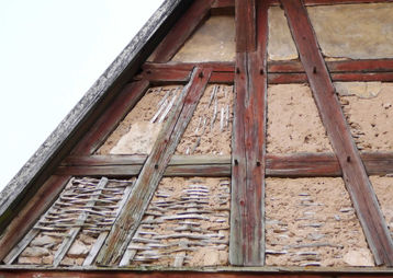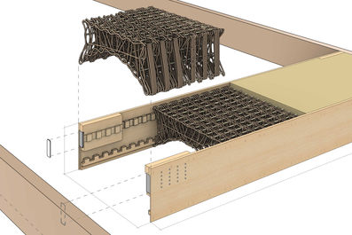 Inspired by traditional half-timbered construction the modular ceiling elements developed for ReSidence are hybrid material components utilising the synergetic combination of willow, earth, and wood. In contrast to this historic reference, where willow and earth served as non-load-bearing infill materials, the digital construction methods developed within the ReSidence project enable a structural synergy of the compressive strength of earth with willow as tension reinforcement, creating a stable, load-bearing structure.